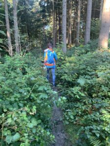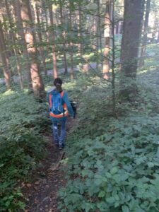 Nachdem sie den Wald verlassen hatten, gingen sie kurz über Asphalt. Dann führte die Spur nur etwa 20 Meter an der Startposition vorbei und stieg steil bergauf in den Wald. Im Wald selbst ging es hinab und dann wieder auf eine Kuppe. Hier verteilten die Partikel über eine grössere Fläche. Für die Hunde war dies eine weitere Herausforderung, bevor sie endlich die Zielperson finden konnten.