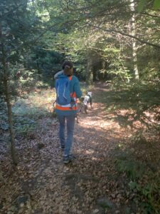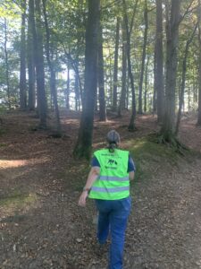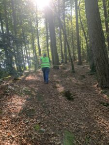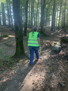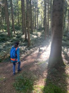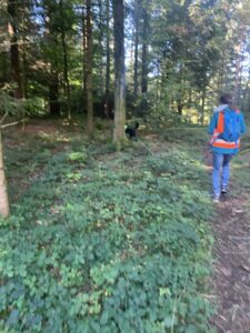 Jetzt war auch die Hundeführerin gefordert, um sicherzustellen, dass sie sich nicht den Kopf an den herabhängenden Ästen stieß. Nach mehreren hundert Metern auf und ab mitten im Wald führte die Spur erneut auf einen breiten Kiesweg. Hier musste die Spur über eine längere Strecke geradeaus verfolgt werden. Dies war für die Hündin eine Herausforderung, da sie ständig prüfen mussten, ob die Spur nicht plötzlich wieder in den Wald abbog.